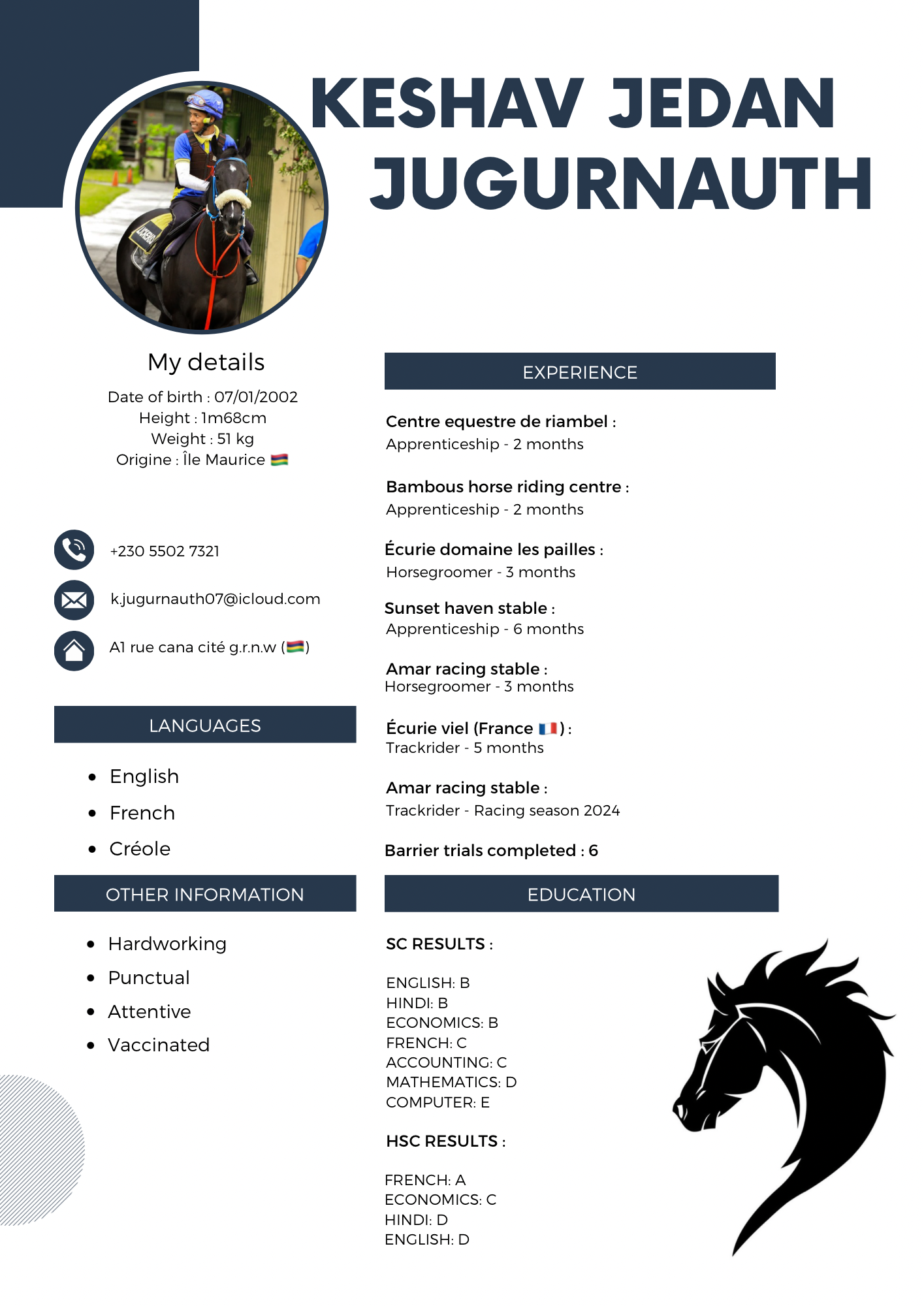 I began my riding journey in Mauritius at Club Hippique de Maurice, completing two professional jockey training stages and earning certification. I was later selected to join the prestigious South African Jockey Academy, where I trained intensively and rode 15–17 horses daily at the Summerveld Training Centre, Durban, South Africa. I also represented the academy in the UK at the British Racing School, gaining international exposure and further developing my equestrian skills. I am committed, disciplined, and continuously eager to learn and improve in the field of horse riding and racing.